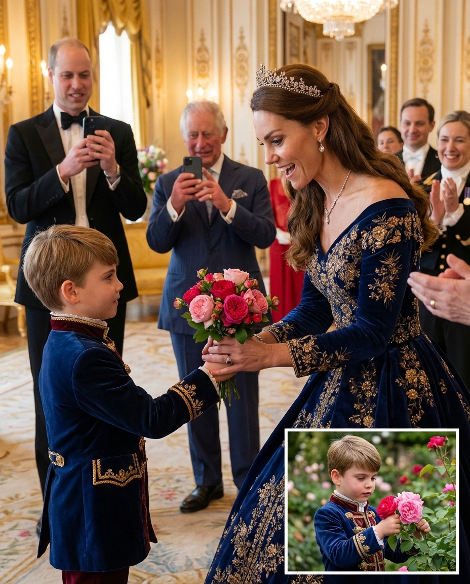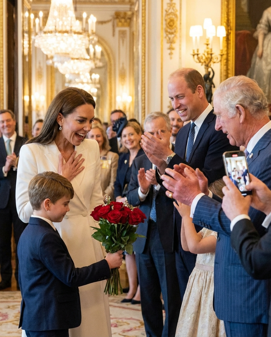 In a touching moment that moved many hearts, Prince Louis, the youngest son of the Duke and Duchess of Cambridge, surprised everyone at Buckingham Palace with a heartfelt gesture for his mother, Princess Catherine of Wales. Holding a bouquet of roses, Louis shyly said, “For you, Catherine,” before presenting the beautiful flowers to his mother. This sweet act not only delighted Princess Catherine but also brought smiles to those present, including Prince William and King Charles.